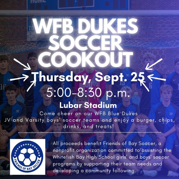 FOBS welcomes friends, family, students and community members to join us for our Fall Cookout! Our only fundraising event, the cookout helps raise much needed funds to directly benefit the Whitefish Bay Soccer program. We'll be selling burgers, hot dogs, chips, treats and more. And the boys will be serving up some GREAT soccer.